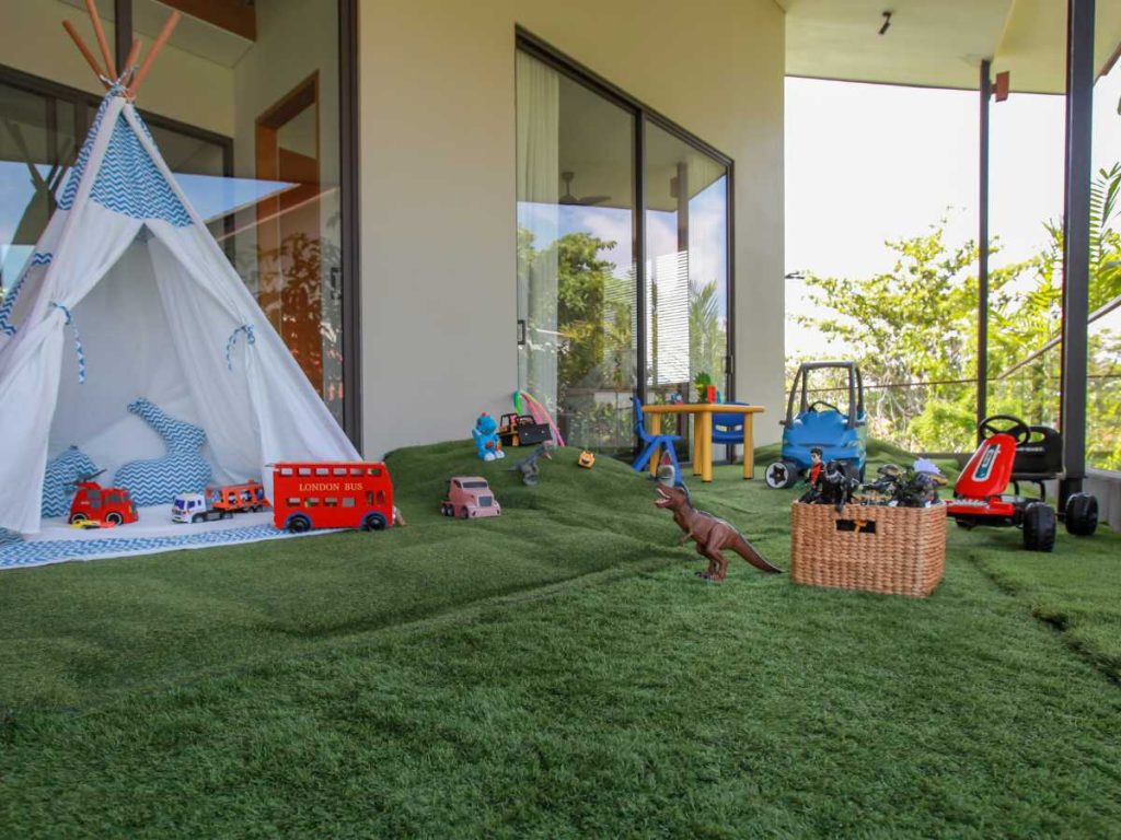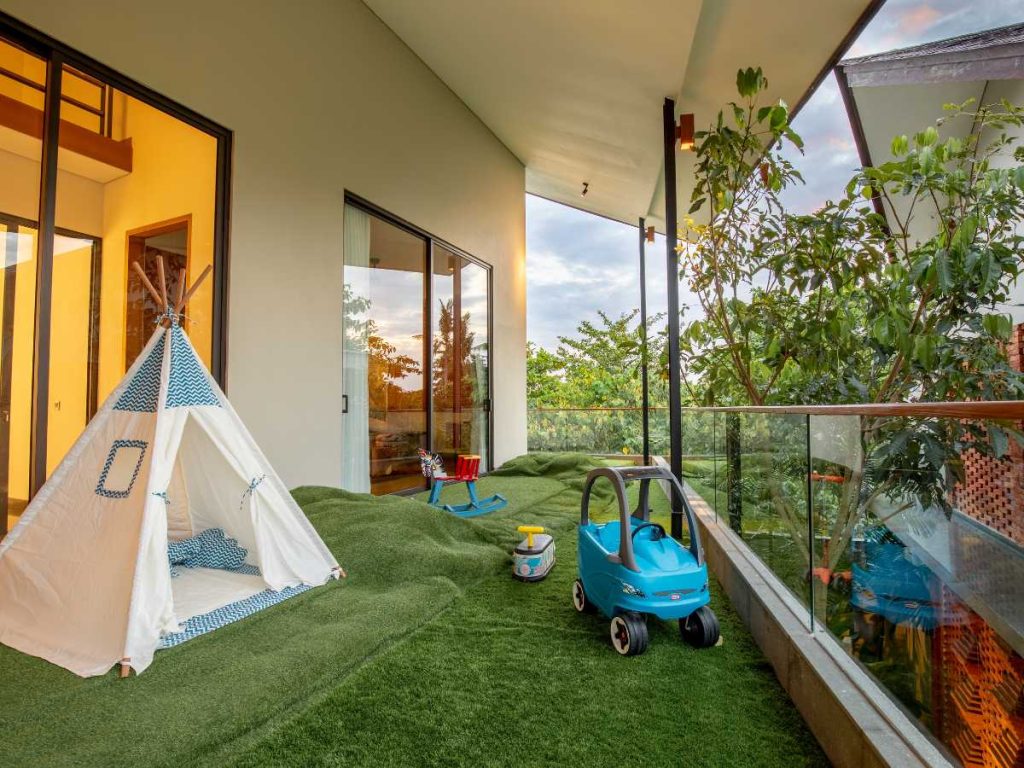 Upstairs, the second and third bedrooms share a breezy living area that opens onto a sunlit terrace and play area.